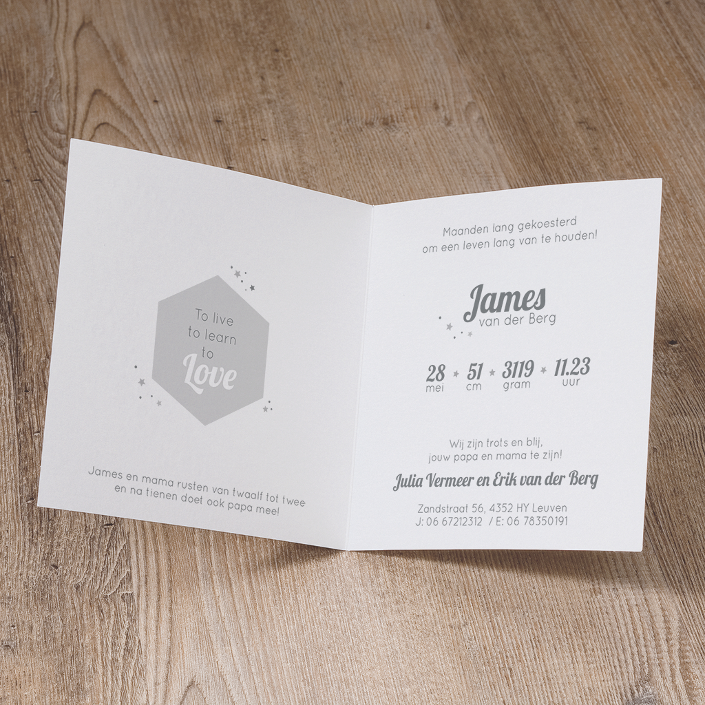 Dit geboortekaartje is gedrukt op metallic papier en wordt geleverd met een extra opplak kaartje.