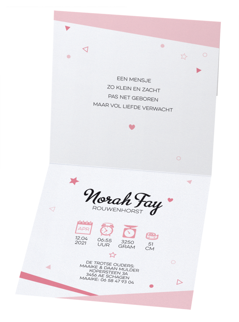 Bij dit geboortekaartje past ook een gekleurde envelop naar keuze.